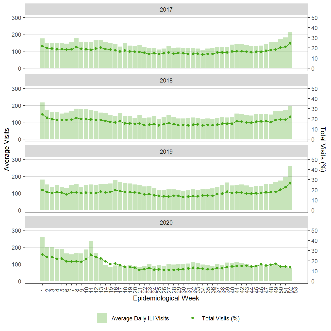 Figure 12. Weekly Respiratory Visits to Emergency Department, Winnipeg Regional Health Authority, Manitoba, 2017 – 2020