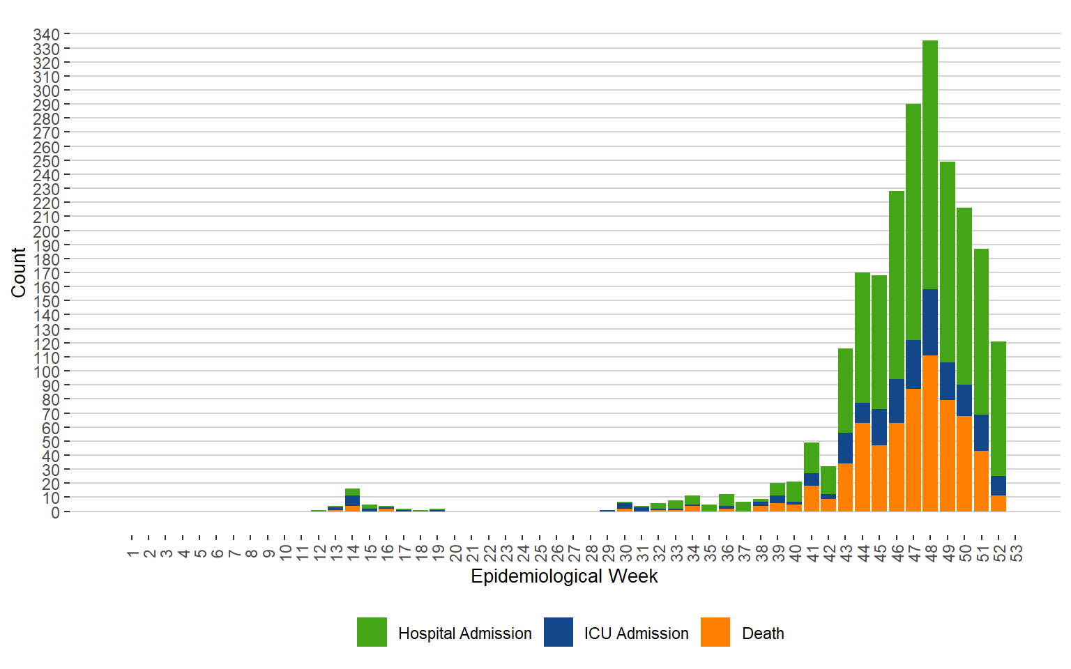 Figure 5. Severe Outcomes of COVID-19 by Week of Public Health Report Date, Manitoba, 2020