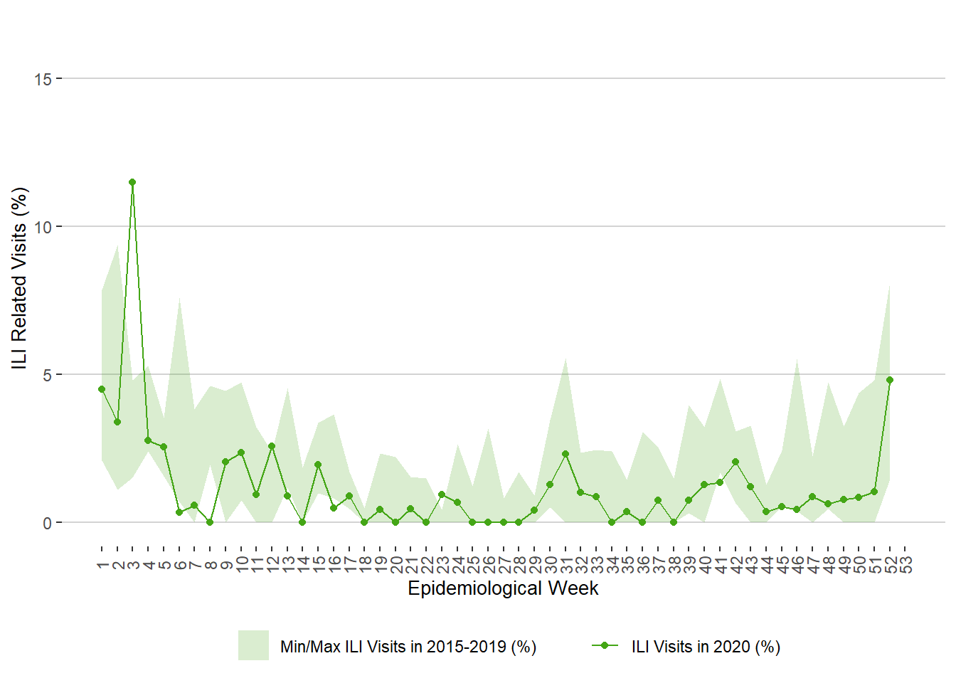 Figure 11. Weekly Percentage of ILI Related Visits to Sentinel Physicians, Manitoba, 2017 – 2020