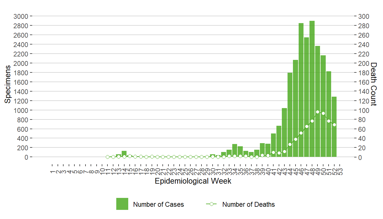 Figure 1. Cases of COVID-19 by Week of Public Health Report Date, Manitoba, 2020