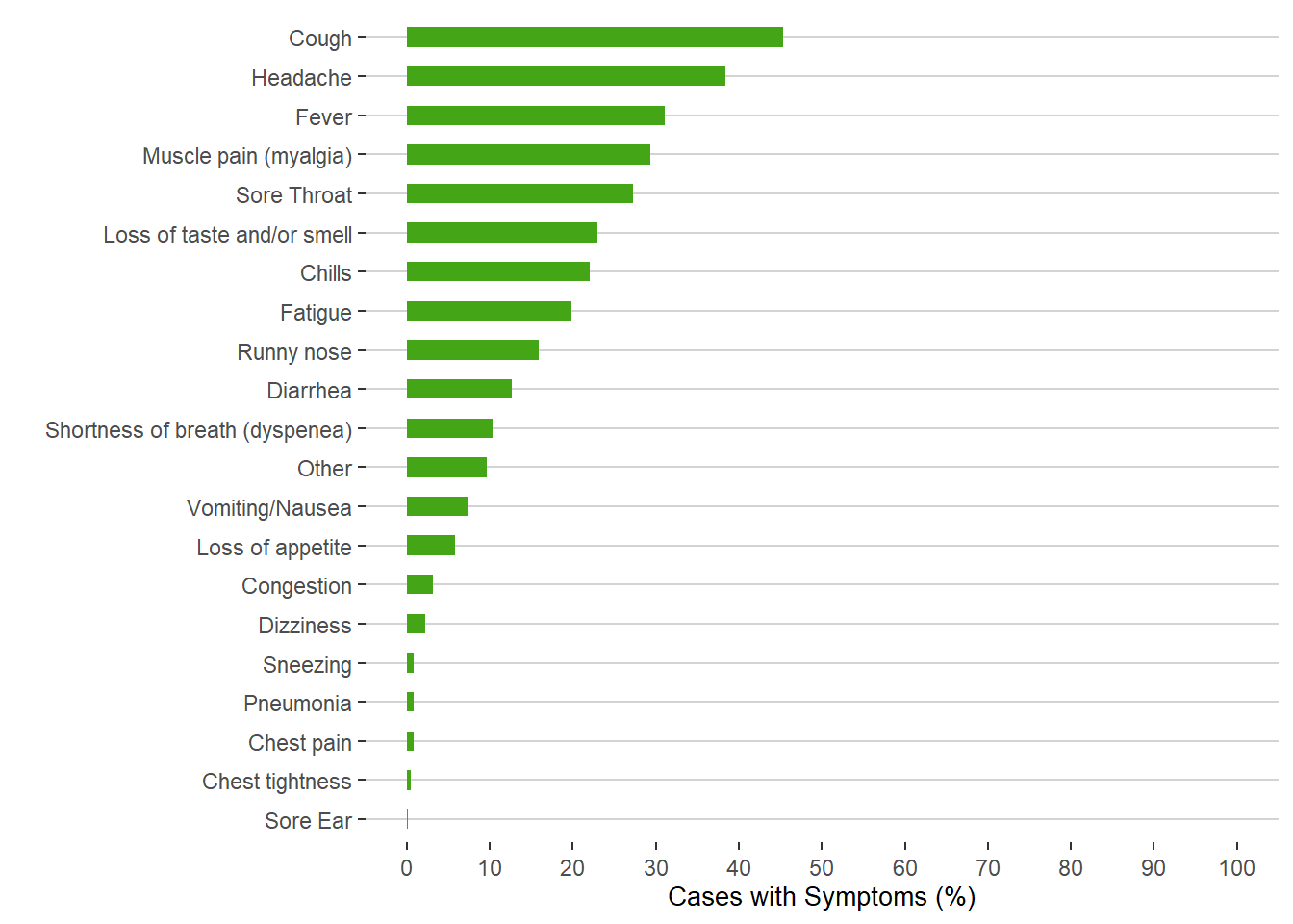 Figure 9. Percentage of Symptoms Reported by COVID-19 Cases, Manitoba, 2020