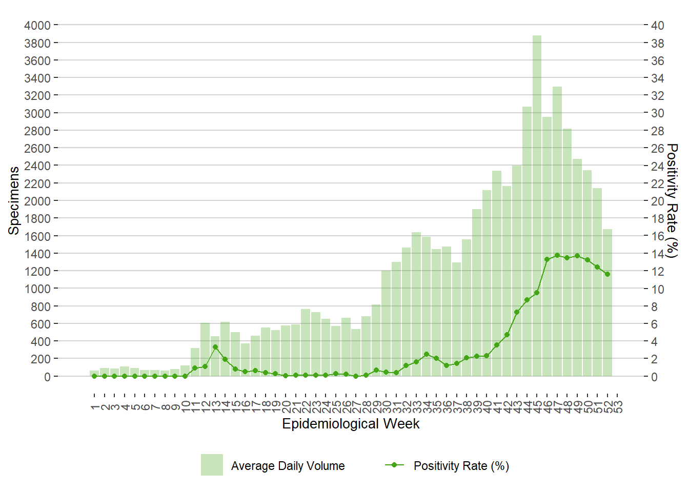 Figure 4. Average Daily Testing Volume and Positivity (%) for COVID-19 by Week of Specimen Receiving Date, Manitoba, 2020