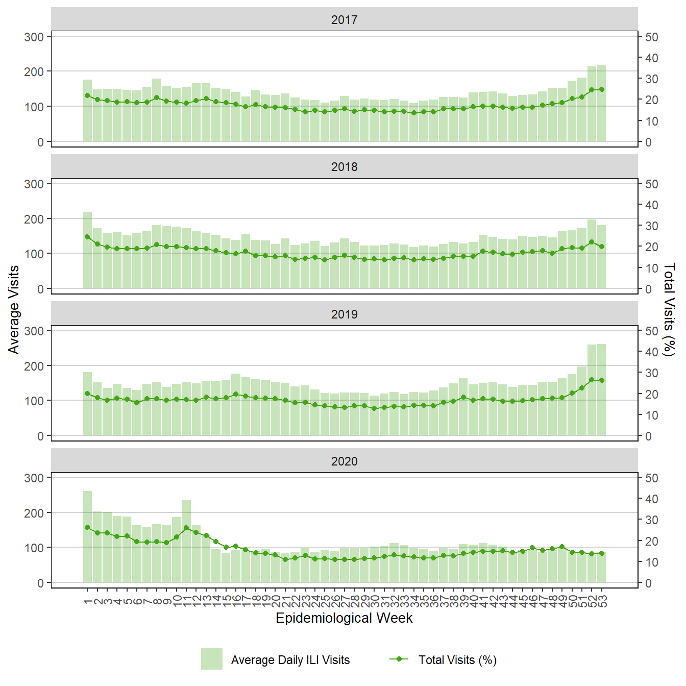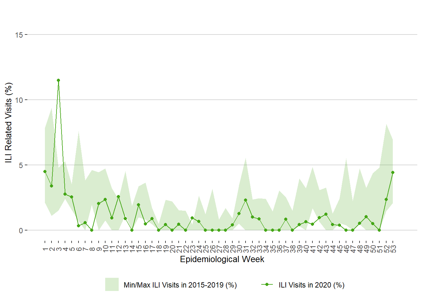 Figure 11. Weekly Percentage of ILI Related Visits to Sentinel Physicians, Manitoba, 2017 – 2020