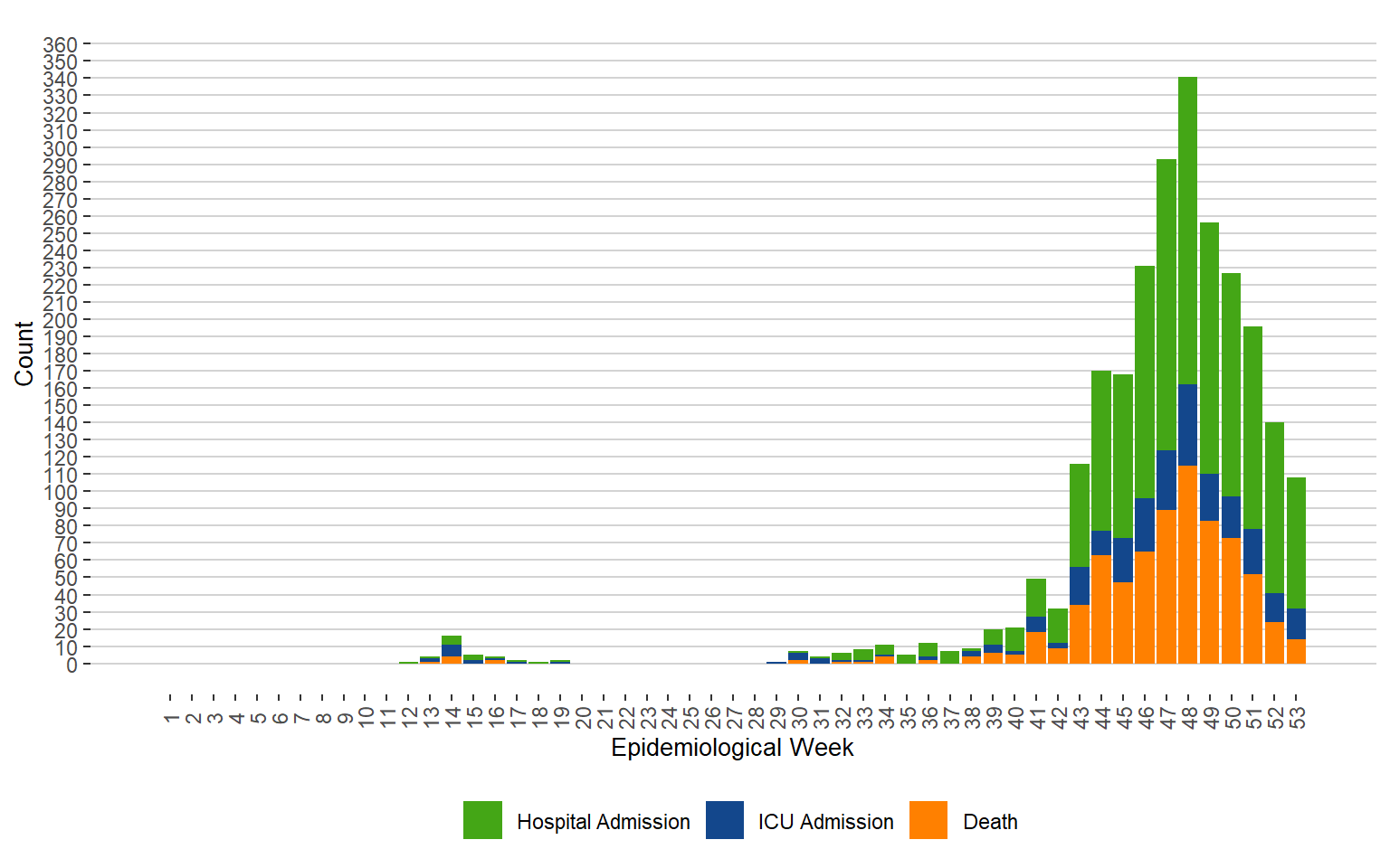 Figure 5. Severe Outcomes of COVID-19 by Week of Public Health Report Date, Manitoba, 2020