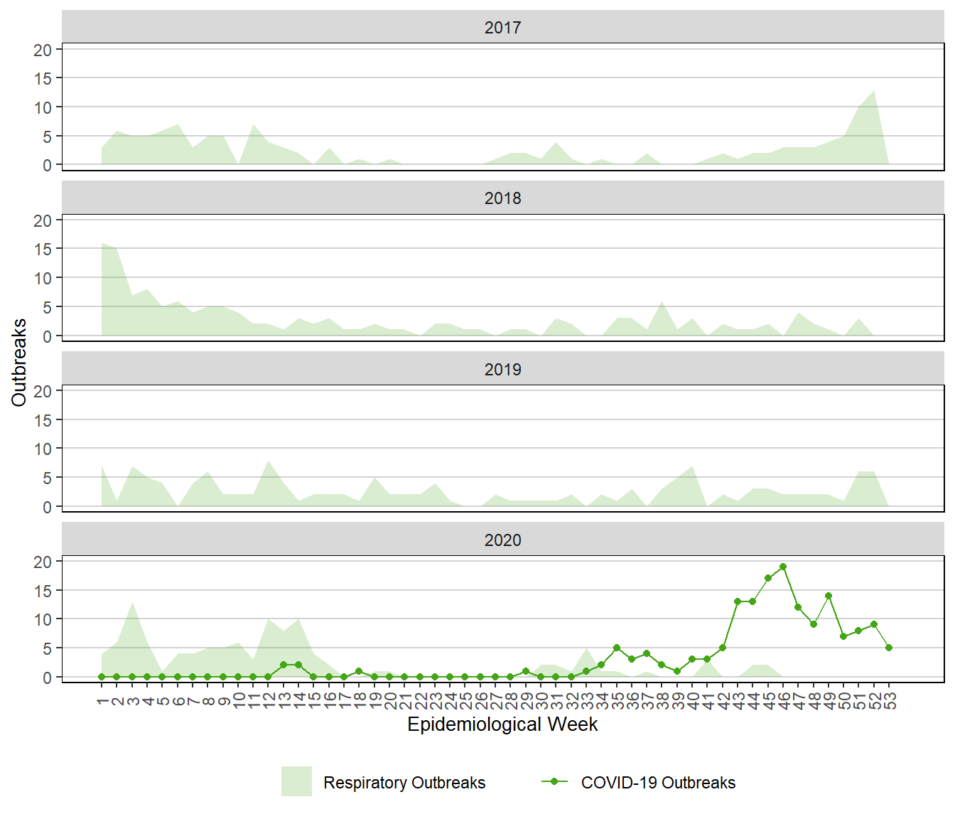 Figure 8. Weekly Respiratory and COVID-19 Outbreaks, Manitoba, 2017 – 2020