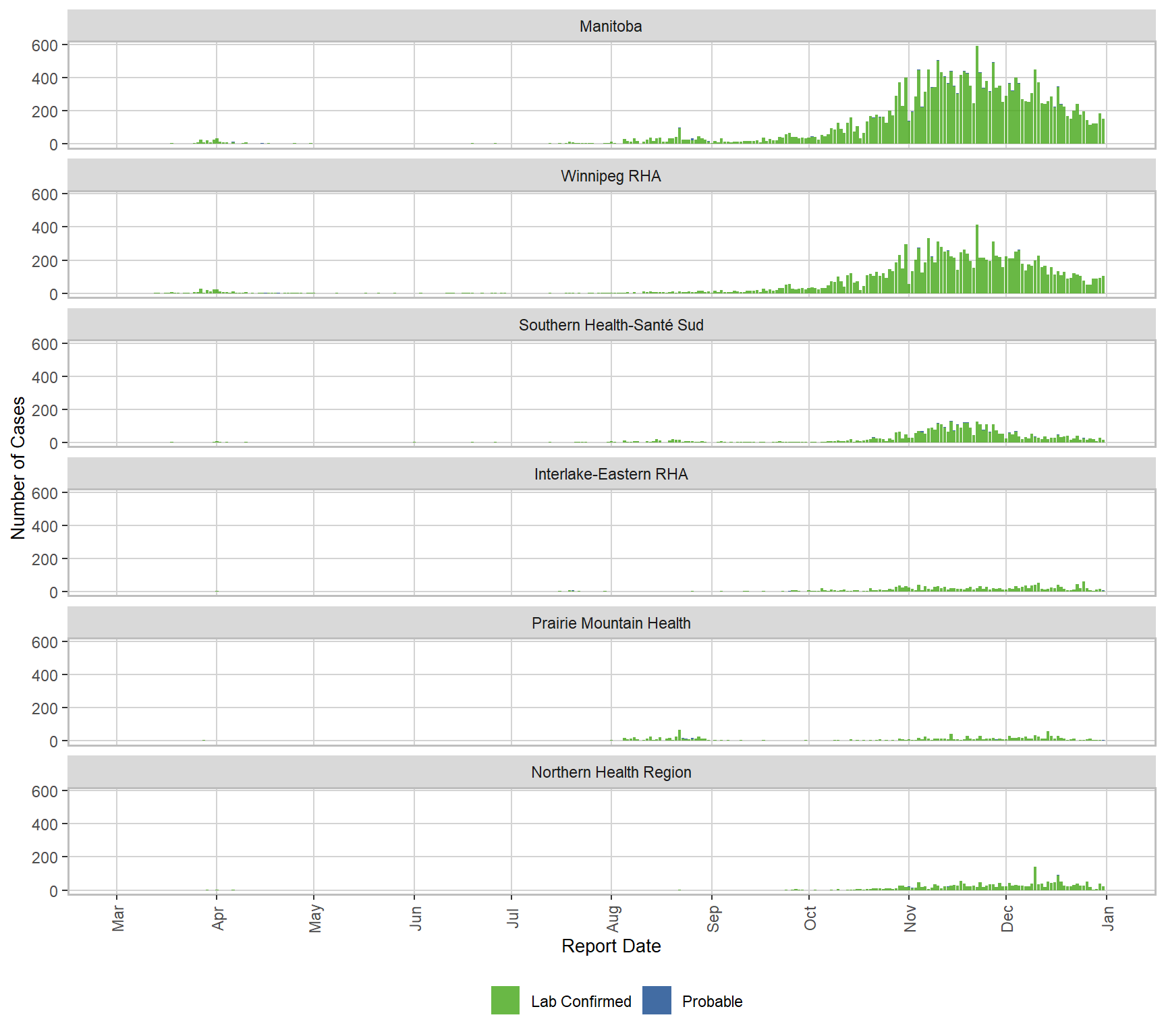 Figure 3. Cases of COVID-19 by Health Region and Public Health Report Date, Manitoba, 2020