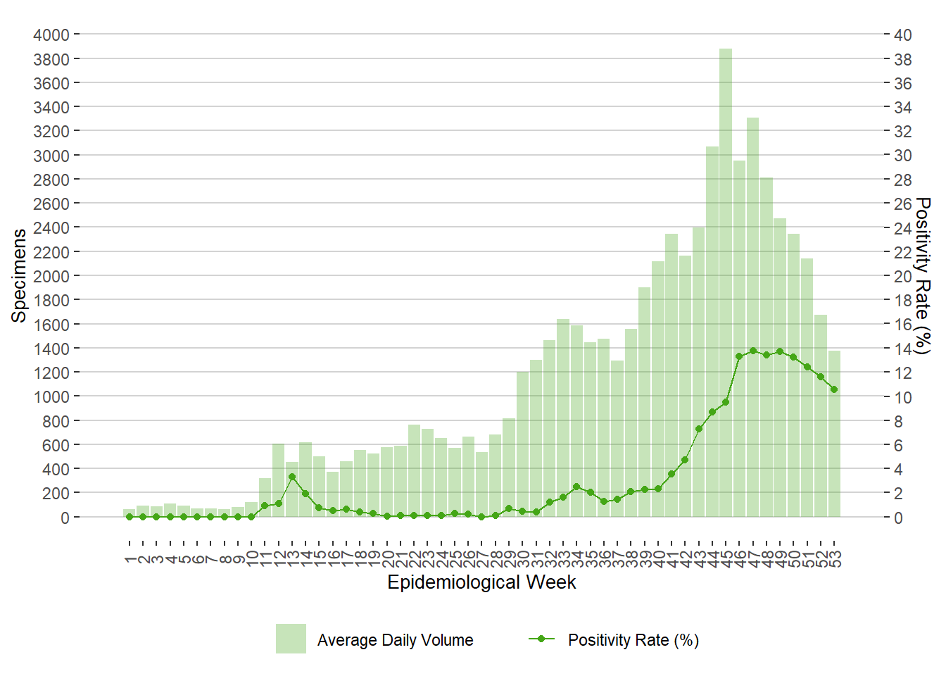 Figure 4. Average Daily Testing Volume and Positivity (%) for COVID-19 by Week of Specimen Receiving Date, Manitoba, 2020