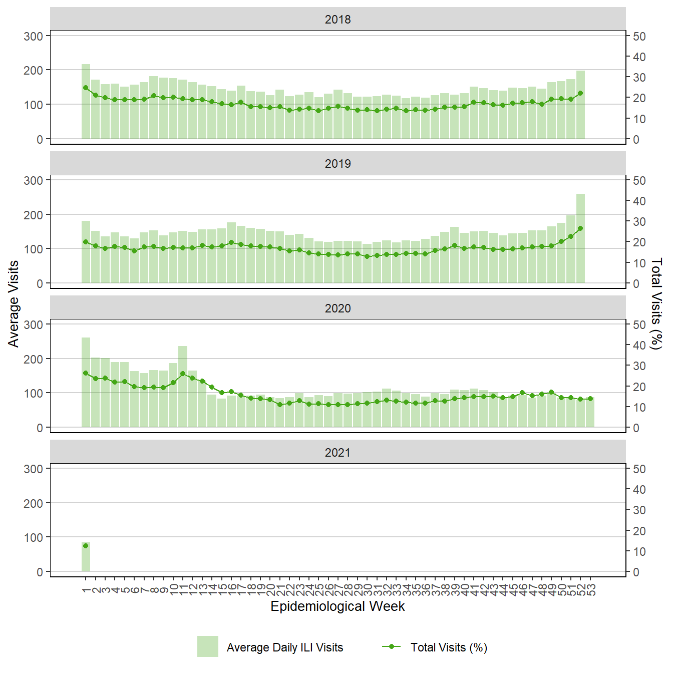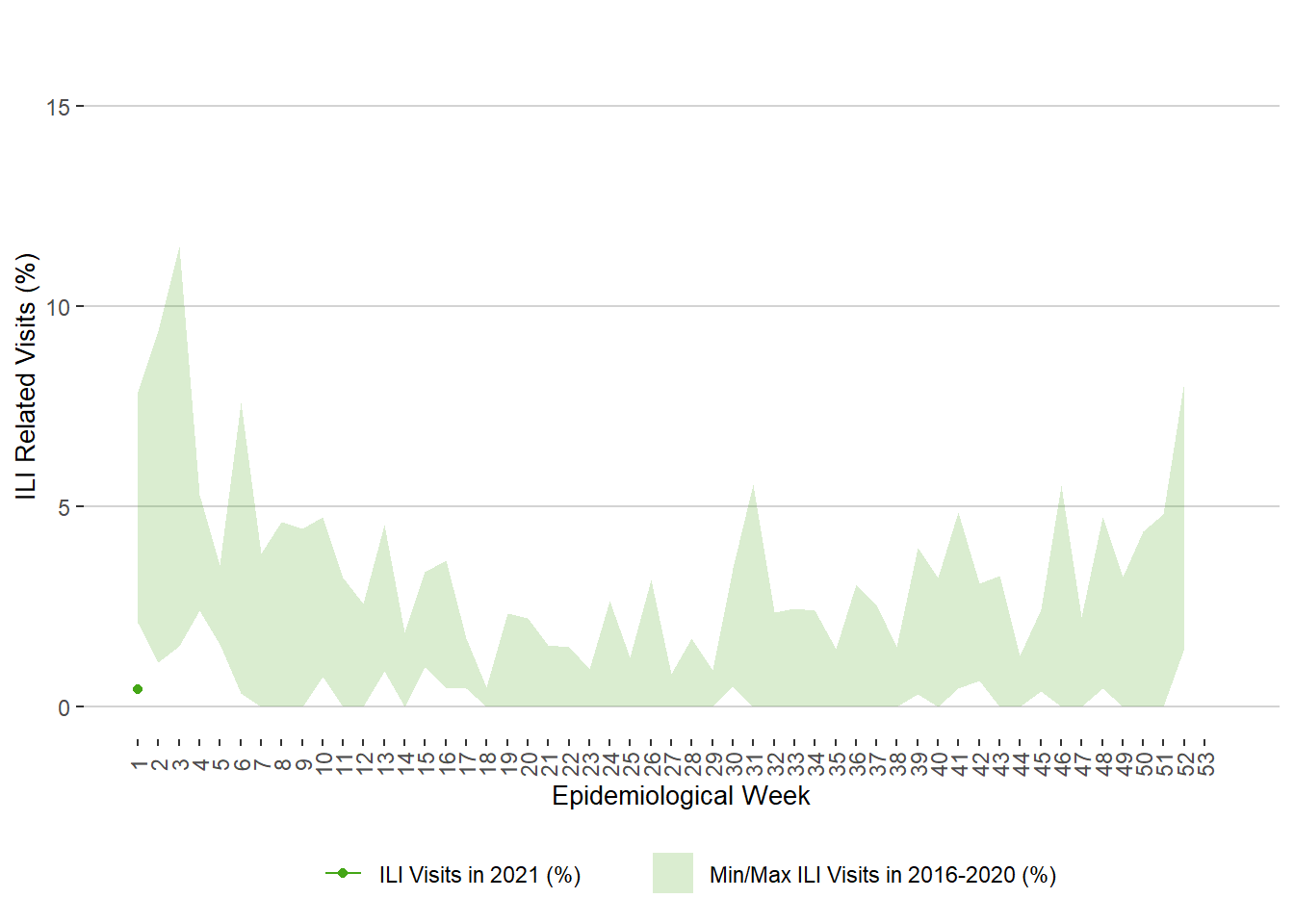 Figure 11. Weekly Percentage of ILI Related Visits to Sentinel Physicians, Manitoba, 2021