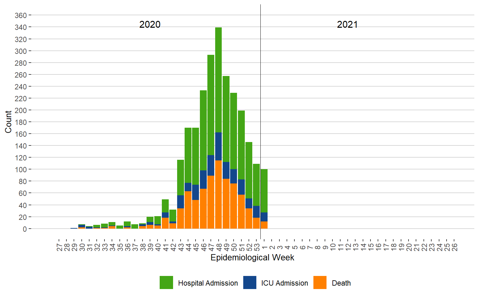 Figure 5. Severe Outcomes of COVID-19 by Week of Public Health Report Date, Manitoba, 2020 – 2021