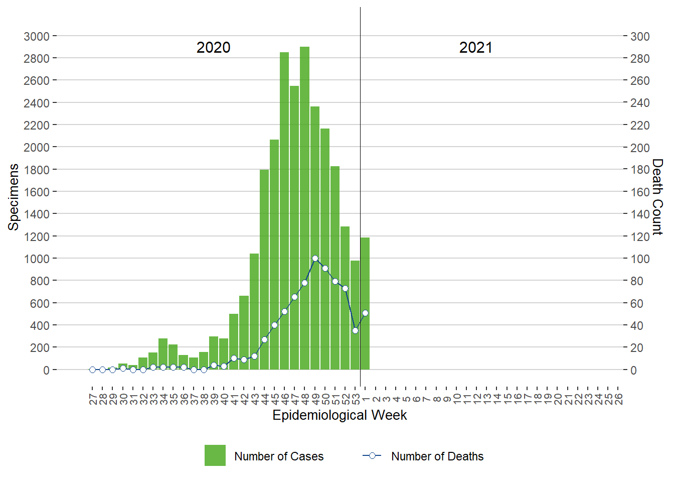 Figure 1. Cases of COVID-19 by Week of Public Health Report Date, Manitoba, 2020 – 2021
