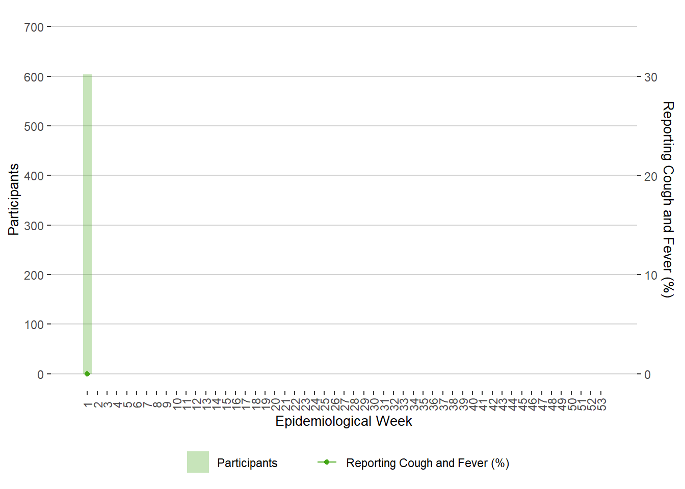 Figure 10. Weekly FluWatchers Participants and Percentage Reporting Fever and Cough, Manitoba, 2021