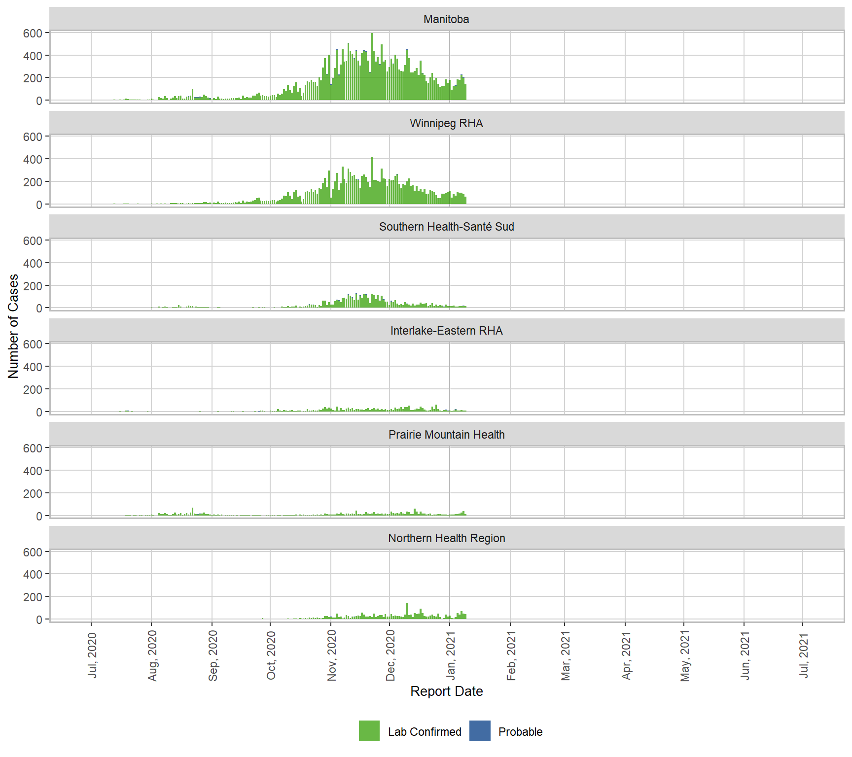Figure 3. Cases of COVID-19 by Health Region and Public Health Report Date, Manitoba, 2020 – 2021