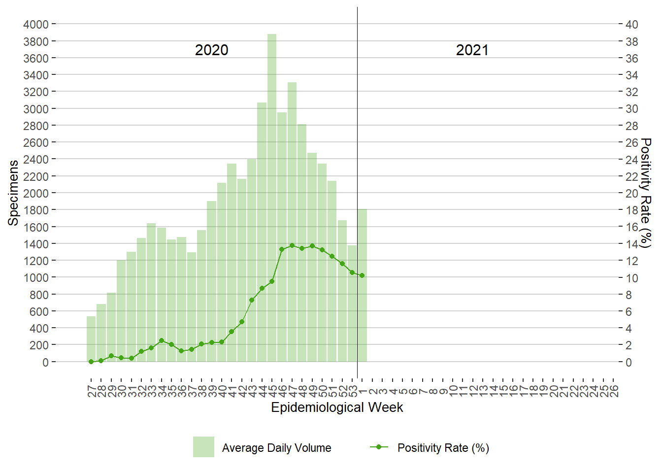 Figure 4. Average Daily Testing Volume and Positivity (%) for COVID-19 by Week of Specimen Receiving Date, Manitoba, 2020 – 2021