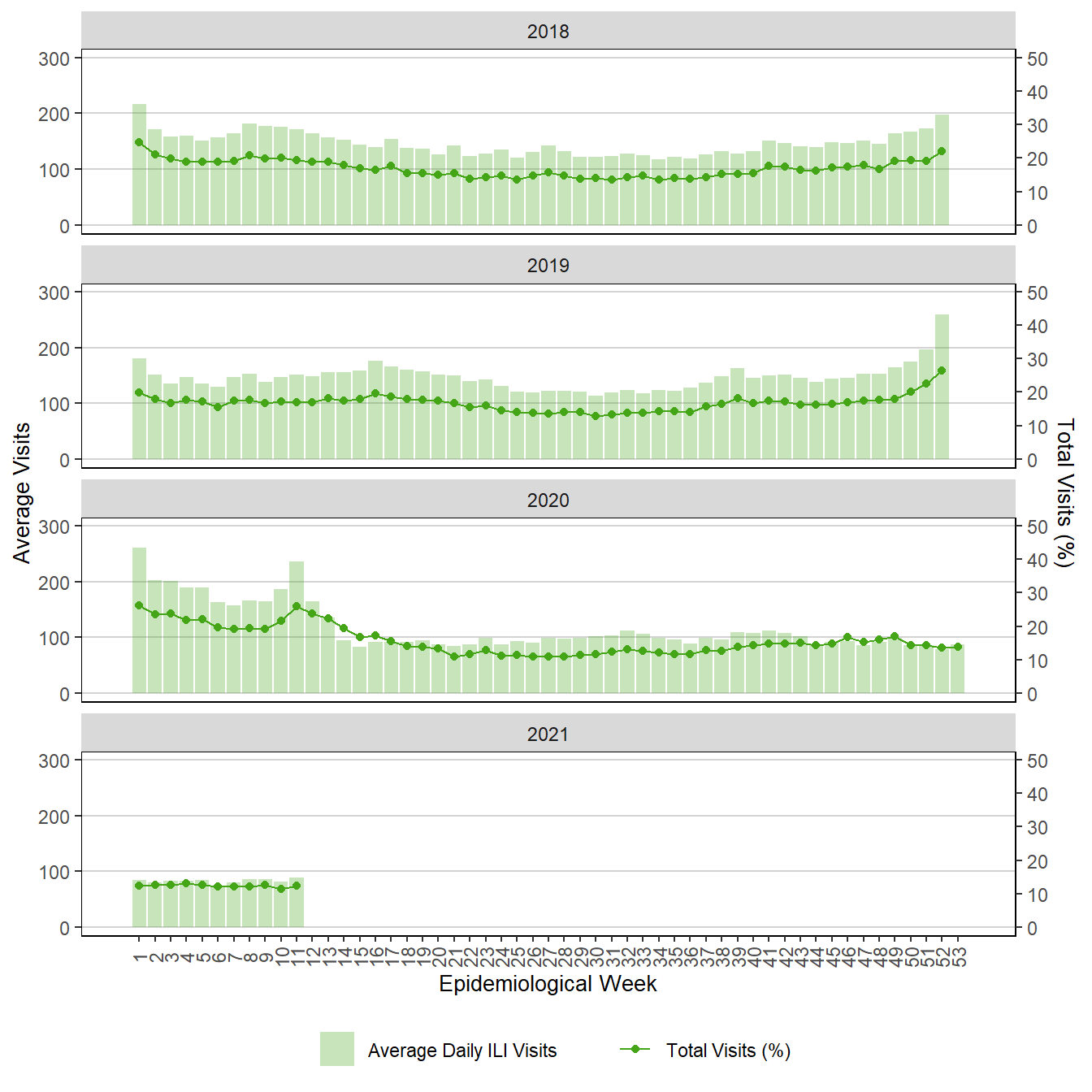 Figure 11. Weekly Percentage of ILI Related Visits to Sentinel Physicians, Manitoba, 2021