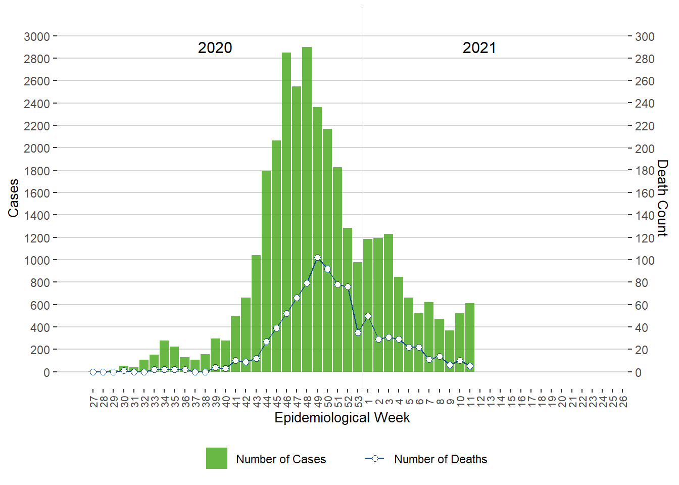 Figure 1. Cases of COVID-19 by Week of Public Health Report Date, Manitoba, 2020 – 2021