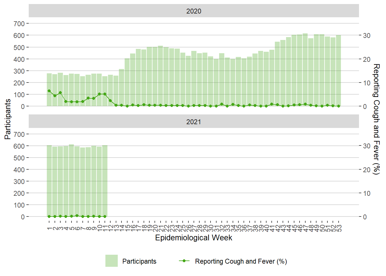 Figure 10. Weekly FluWatchers Participants and Percentage Reporting Fever and Cough, Manitoba, 2021