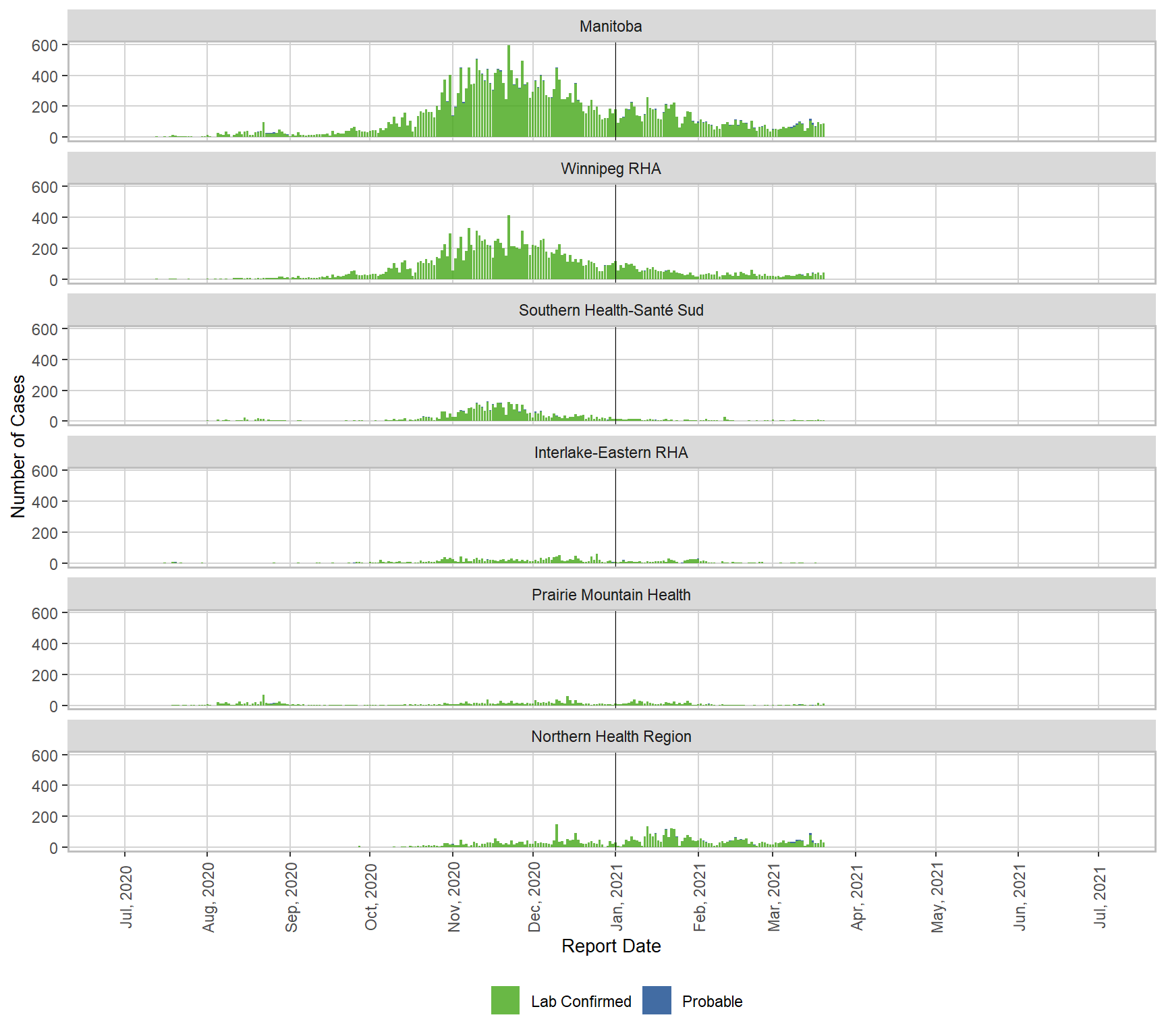 Figure 3. Cases of COVID-19 by Health Region and Public Health Report Date, Manitoba, 2020 – 2021