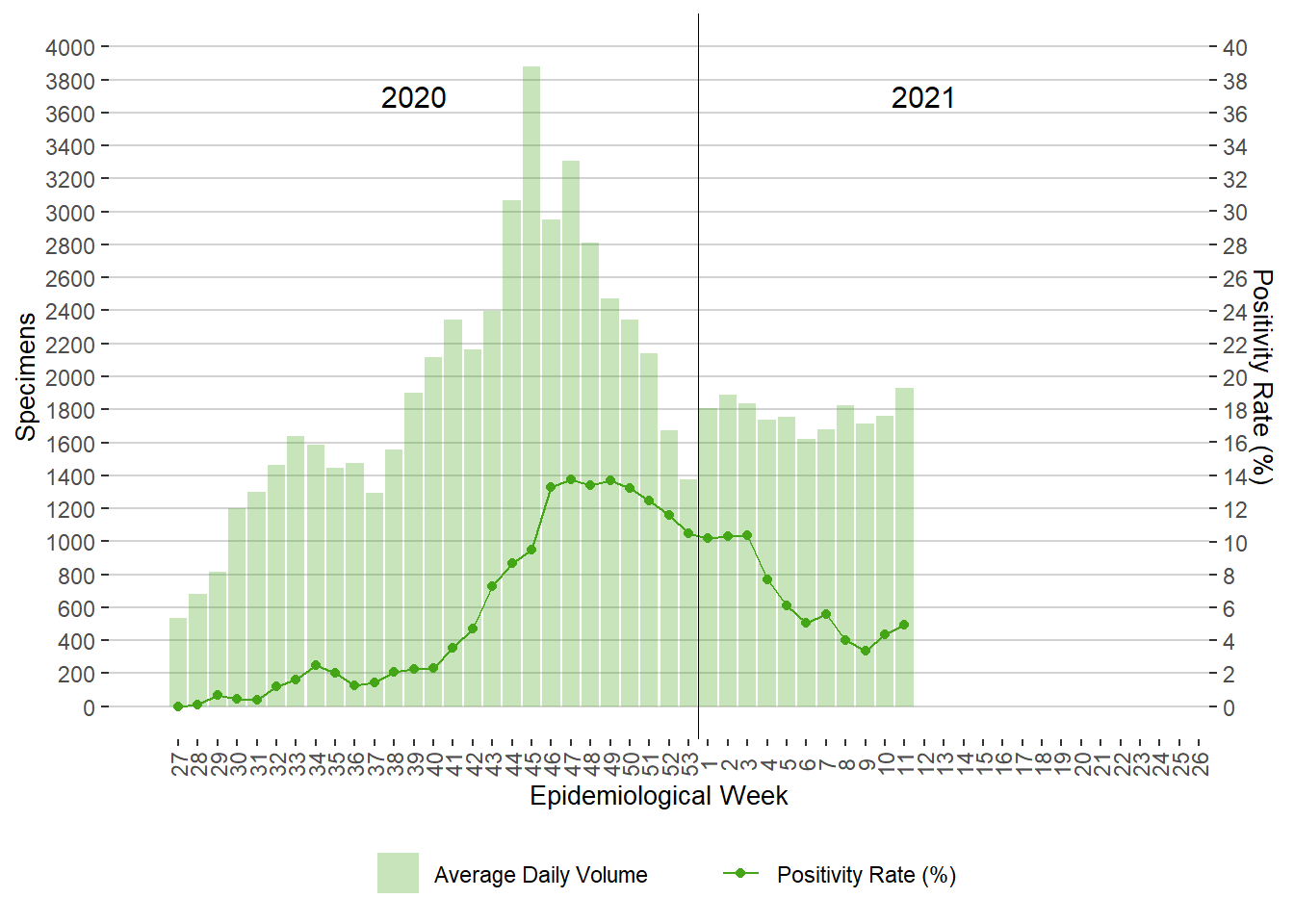 Figure 4. Average Daily Testing Volume and Positivity (%) for COVID-19 by Week of Specimen Receiving Date, Manitoba, 2020 – 2021