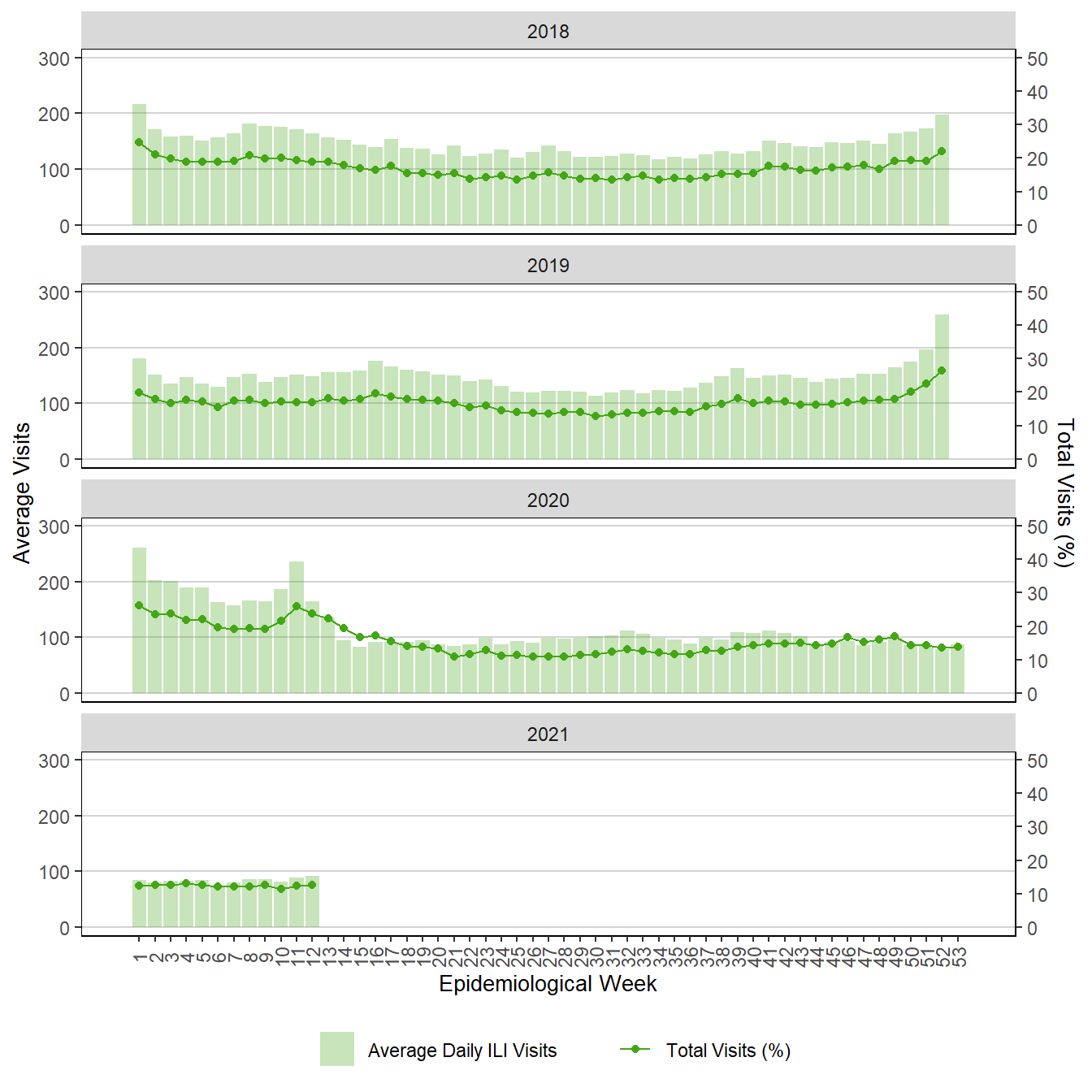 Figure 12. Weekly Respiratory Visits to Emergency Department, Winnipeg Regional Health Authority, Manitoba, 2018 – 2021