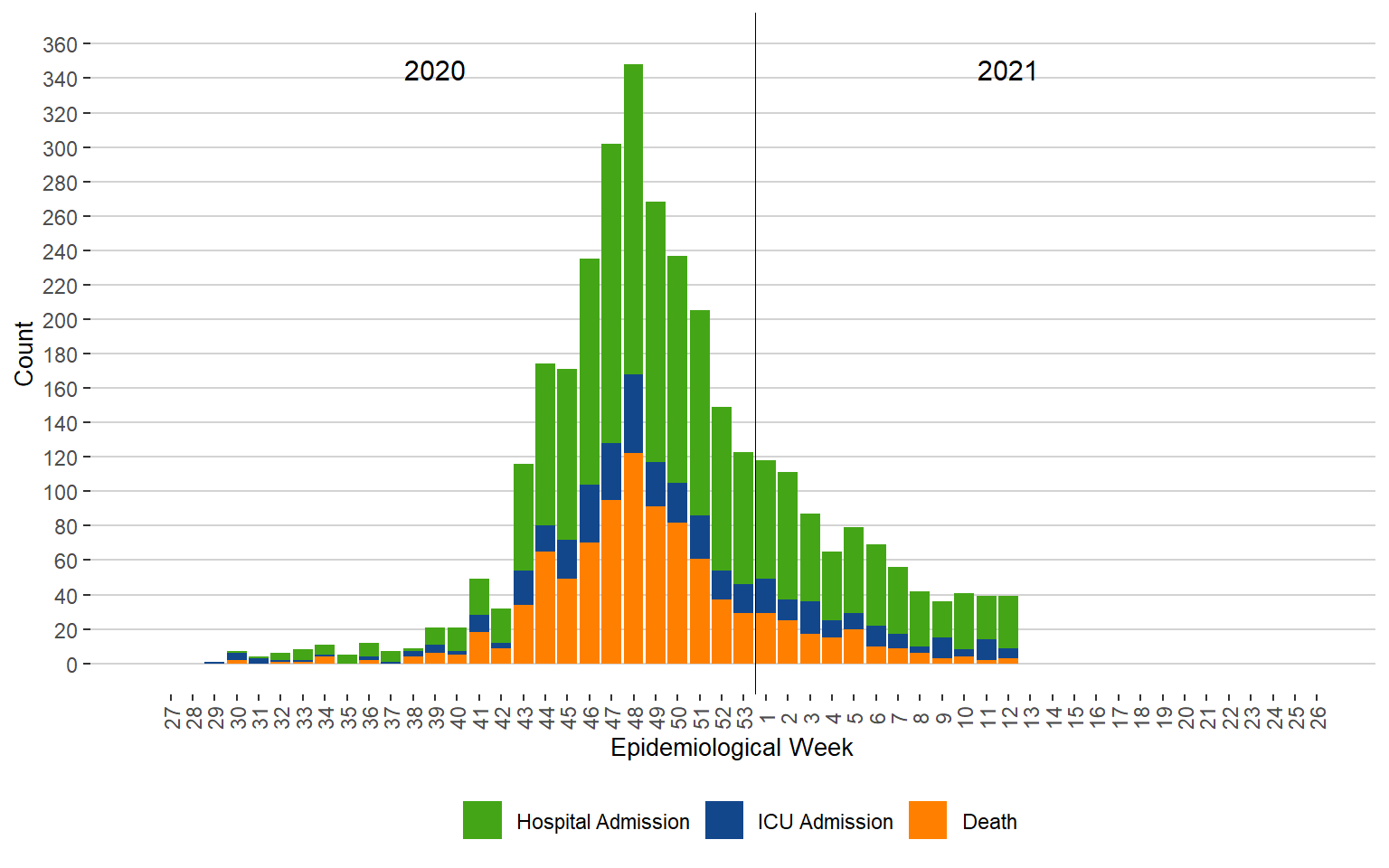 Figure 5. Severe Outcomes of COVID-19 by Week of Public Health Report Date, Manitoba, 2020 – 2021