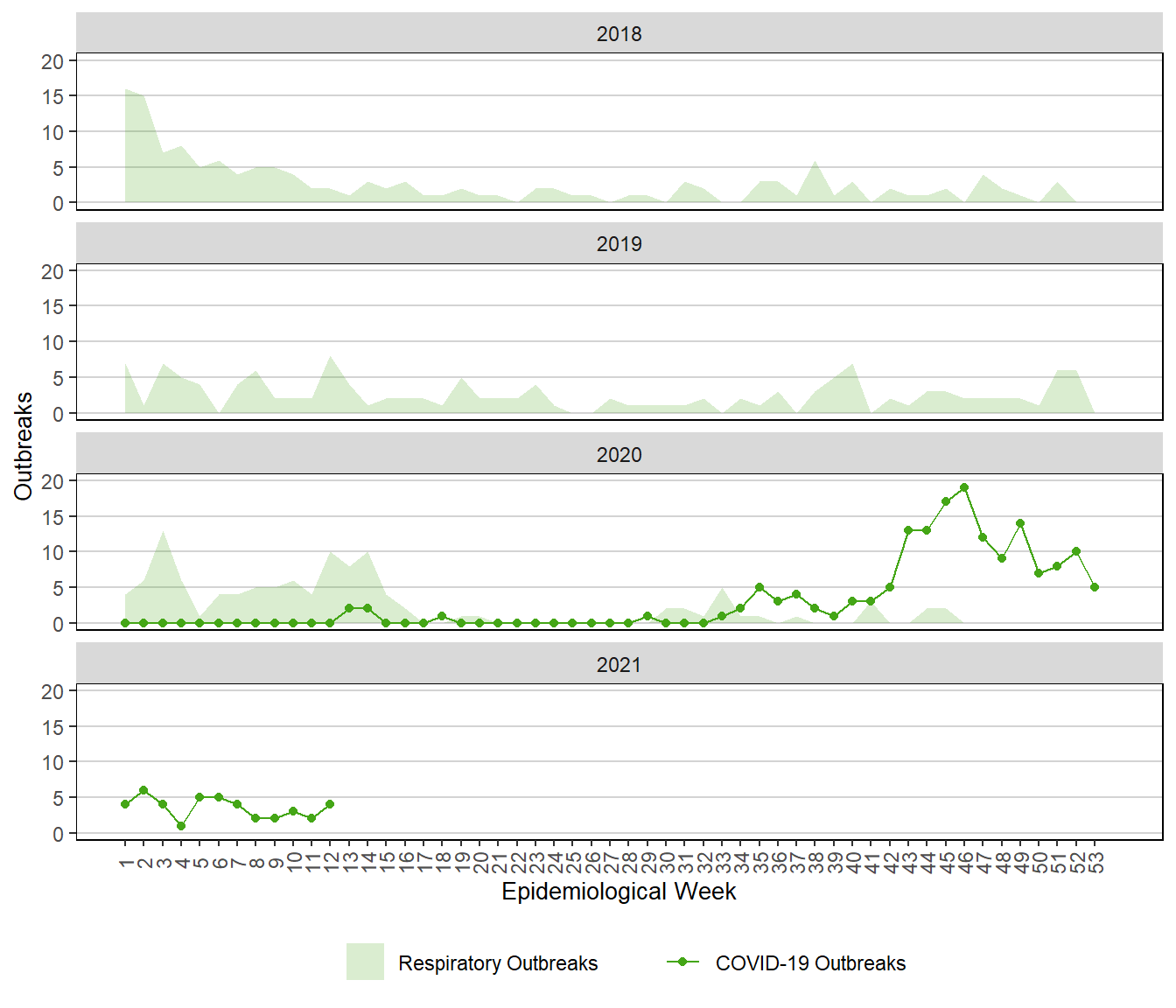 Figure 8. Weekly Respiratory and COVID-19 Outbreaks, Manitoba, 2018 – 2021