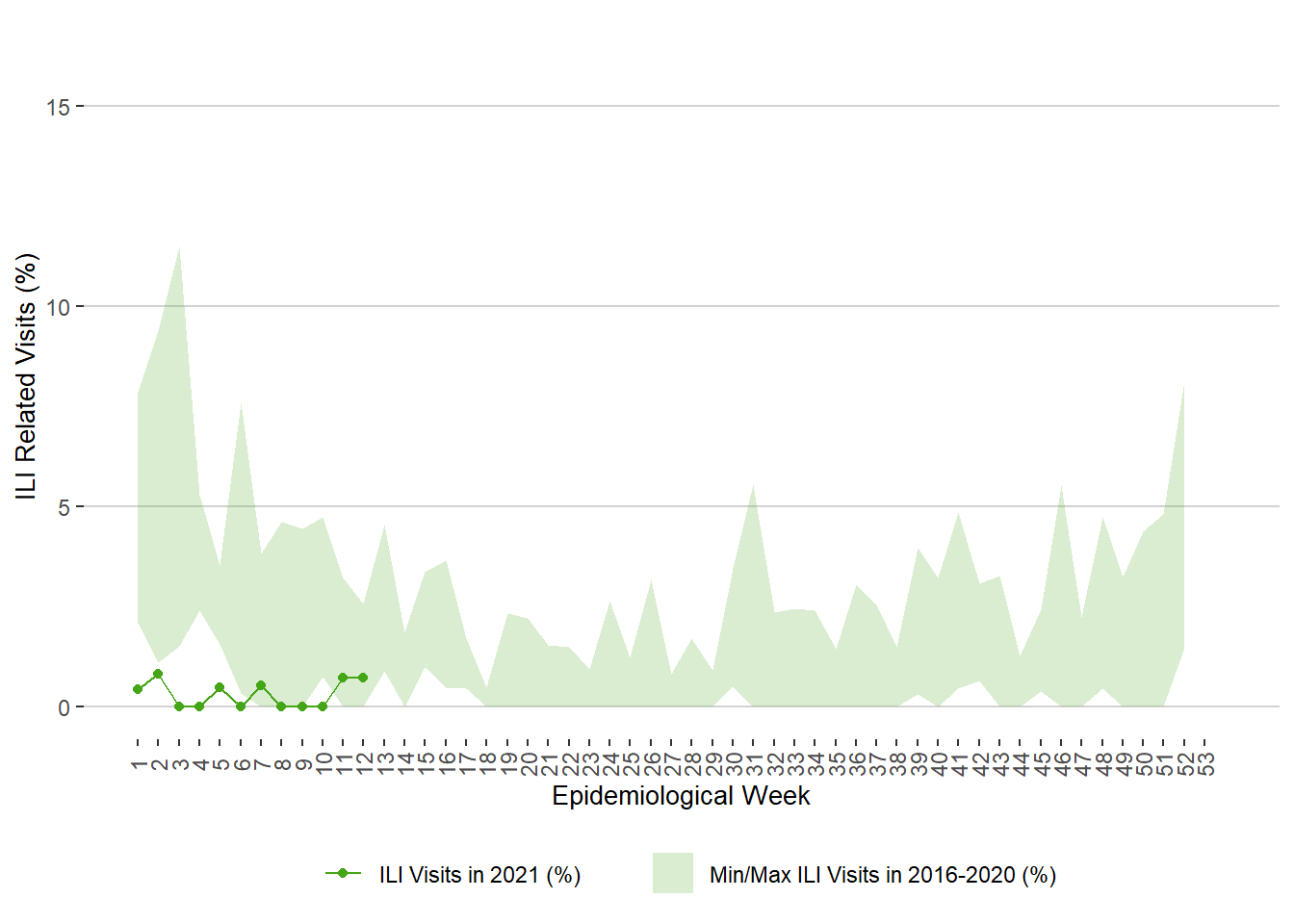 Figure 11. Weekly Percentage of ILI Related Visits to Sentinel Physicians, Manitoba, 2021