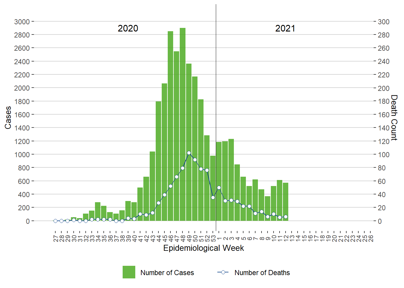 Figure 1. Cases of COVID-19 by Week of Public Health Report Date, Manitoba, 2020 – 2021