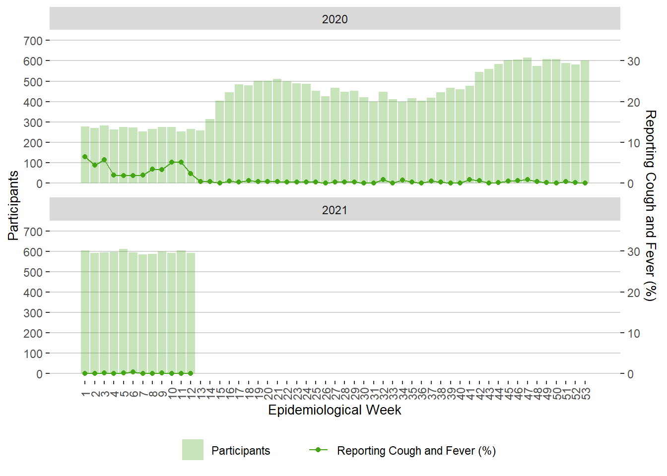 Figure 10. Weekly FluWatchers Participants and Percentage Reporting Fever and Cough, Manitoba, 2021