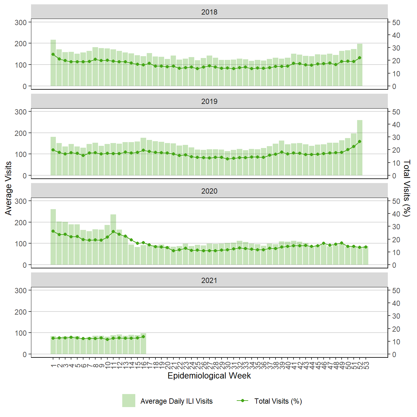 Figure 13. Weekly Respiratory Visits to Emergency Department, Winnipeg Regional Health Authority, Manitoba, 2018 – 2021