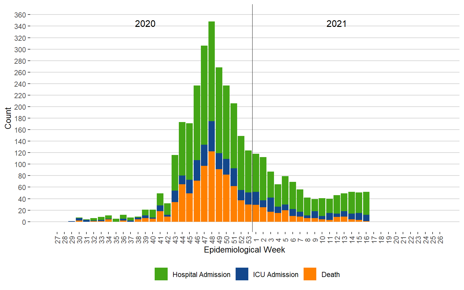 Figure 6. Severe Outcomes of COVID-19 by Week of Public Health Report Date, Manitoba, June 2020 – Present