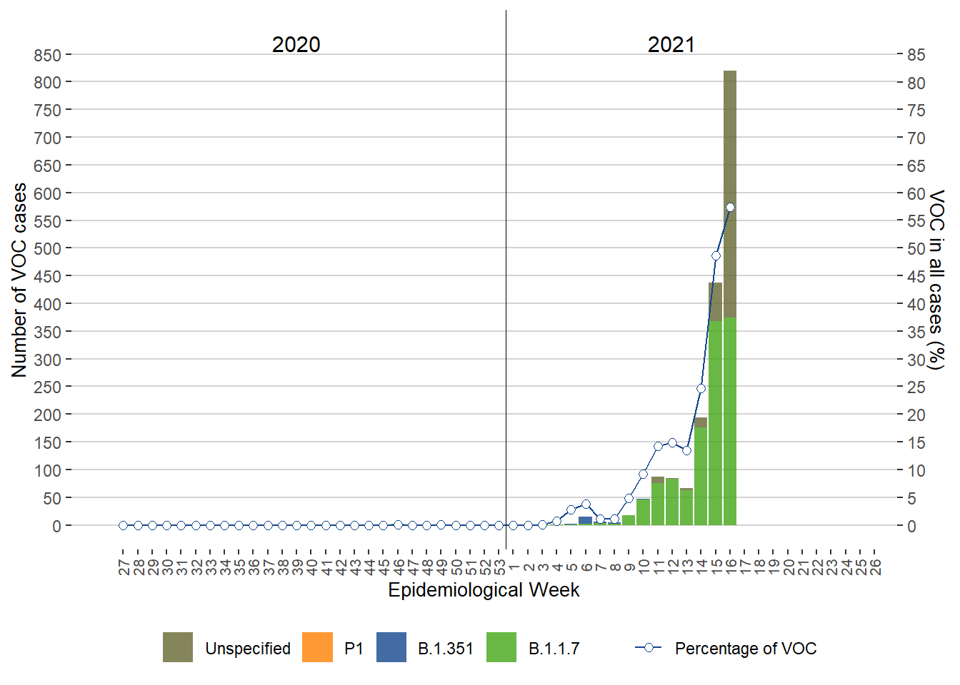 Figure 2. COVID-19 Cases of Variants of Concern (VOC) by Type and Percentage of VOC Cases in All Cases by Week of Public Health Report Date, Manitoba, June 2020 – Present