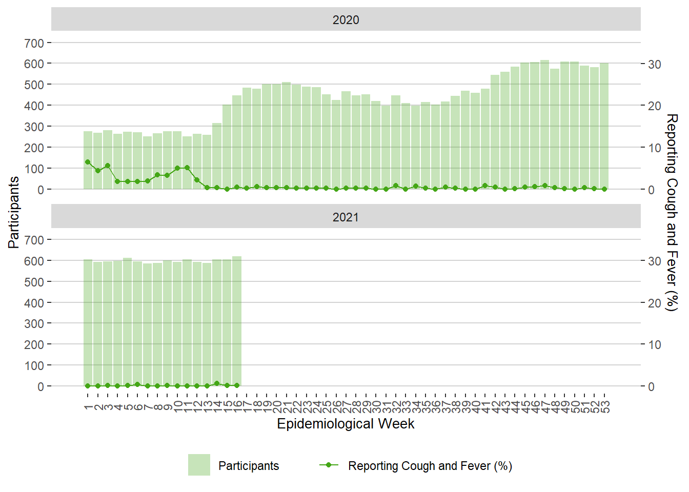 Figure 11. Weekly FluWatchers Participants and Percentage Reporting Fever and Cough, Manitoba, 2020 – 2021