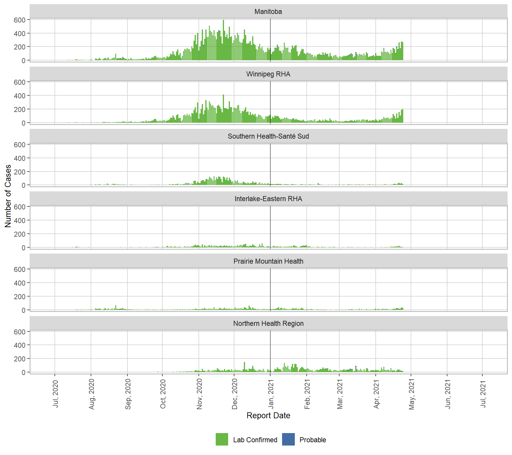 Figure 4. Cases of COVID-19 by Health Region and Public Health Report Date, Manitoba, June 2020 – Present