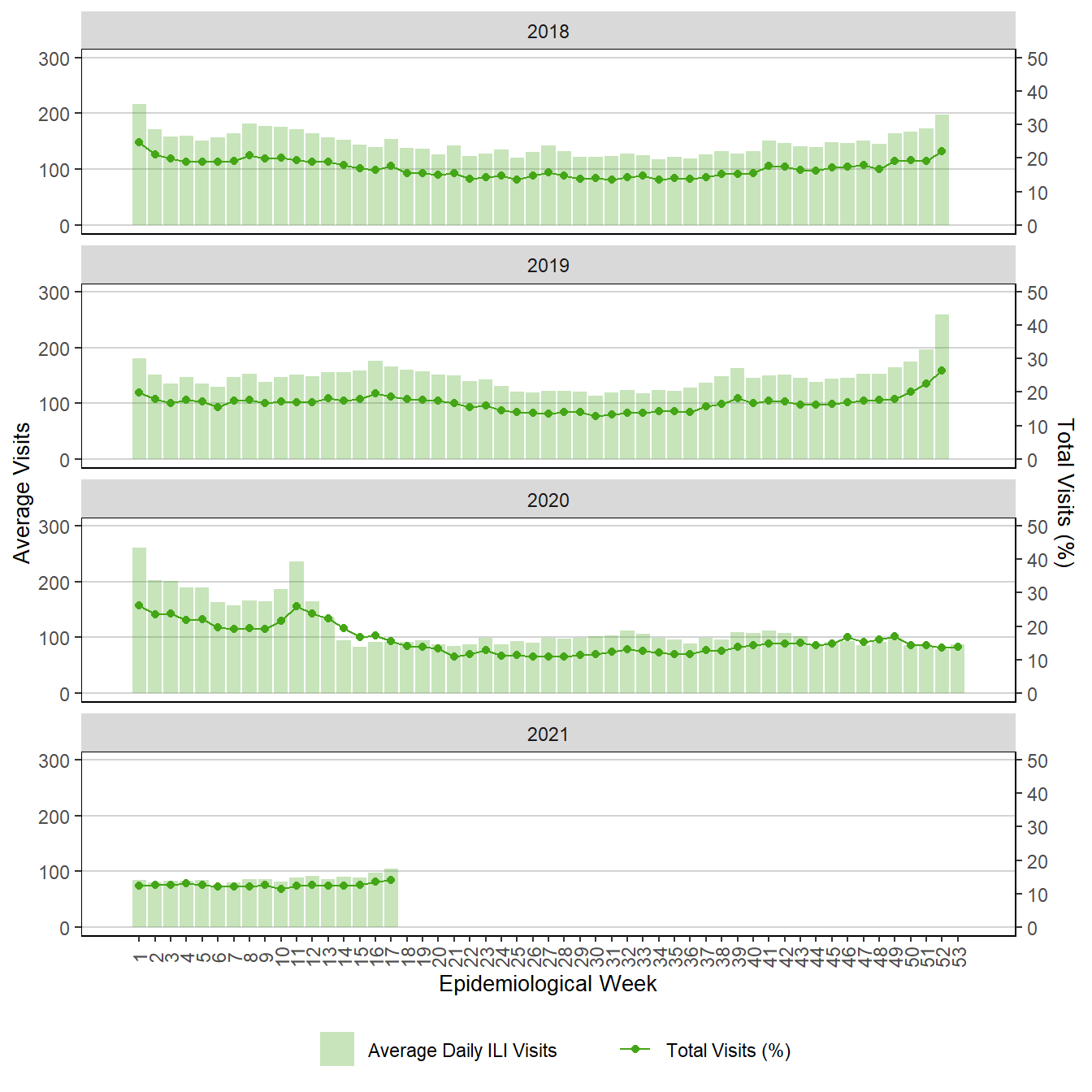 Figure 13. Weekly Respiratory Visits to Emergency Department, Winnipeg Regional Health Authority, Manitoba, 2018 – 2021