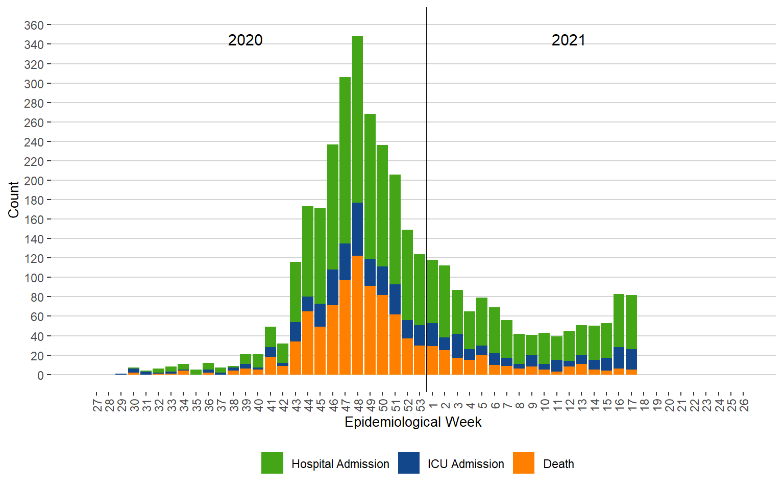 Figure 6. Severe Outcomes of COVID-19 by Week of Public Health Report Date, Manitoba, June 2020 – Present