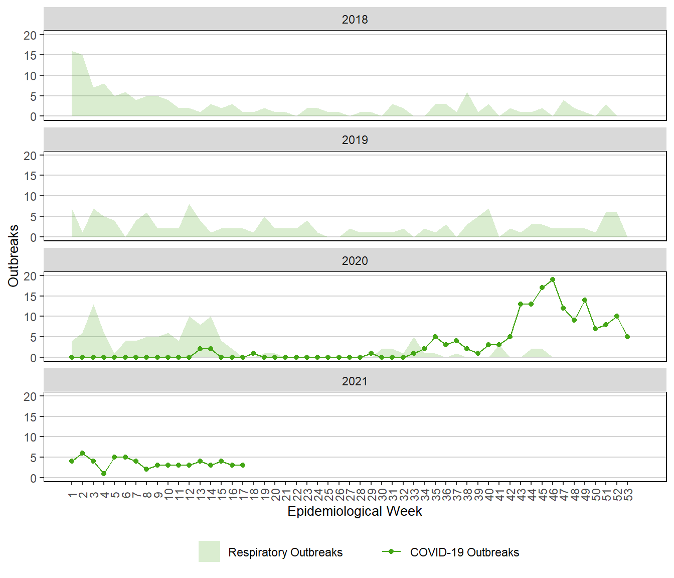 Figure 9. Weekly Respiratory and COVID-19 Outbreaks, Manitoba, 2018 – 2021
