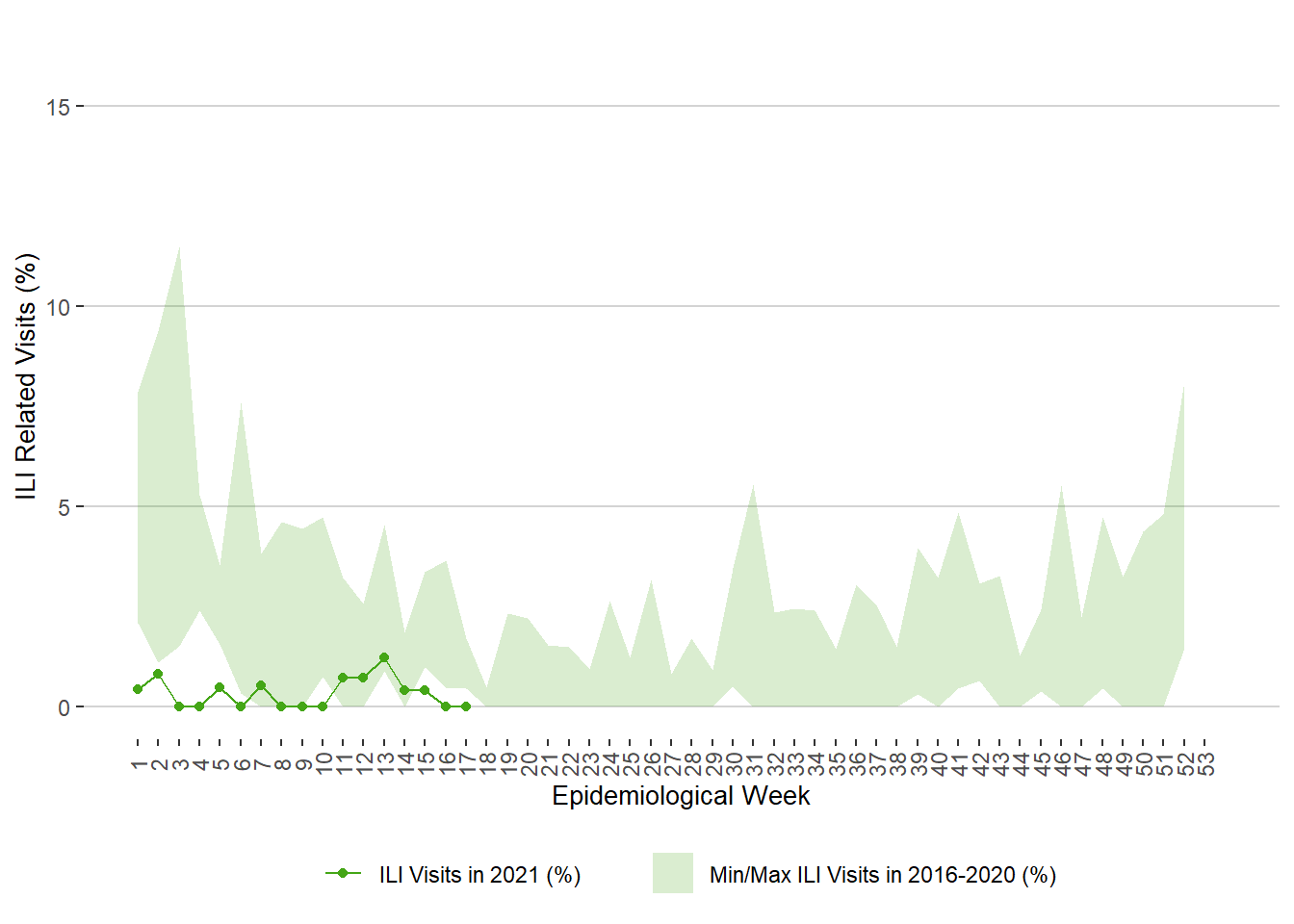 Figure 12. Weekly Percentage of ILI Related Visits to Sentinel Physicians, Manitoba, 2021