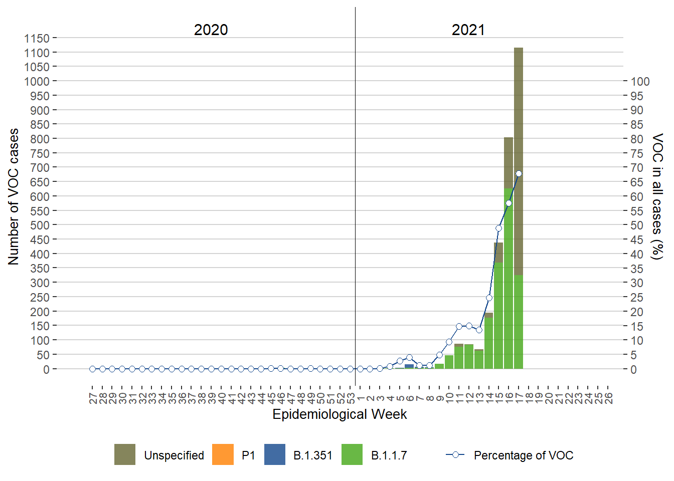 Figure 2. COVID-19 Cases of Variants of Concern (VOC) by Type and Percentage of VOC Cases in All Cases by Week of Public Health Report Date, Manitoba, June 2020 – Present