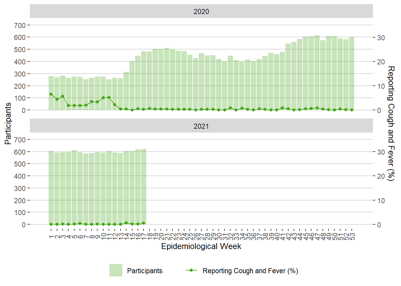 Figure 11. Weekly FluWatchers Participants and Percentage Reporting Fever and Cough, Manitoba, 2020 – 2021