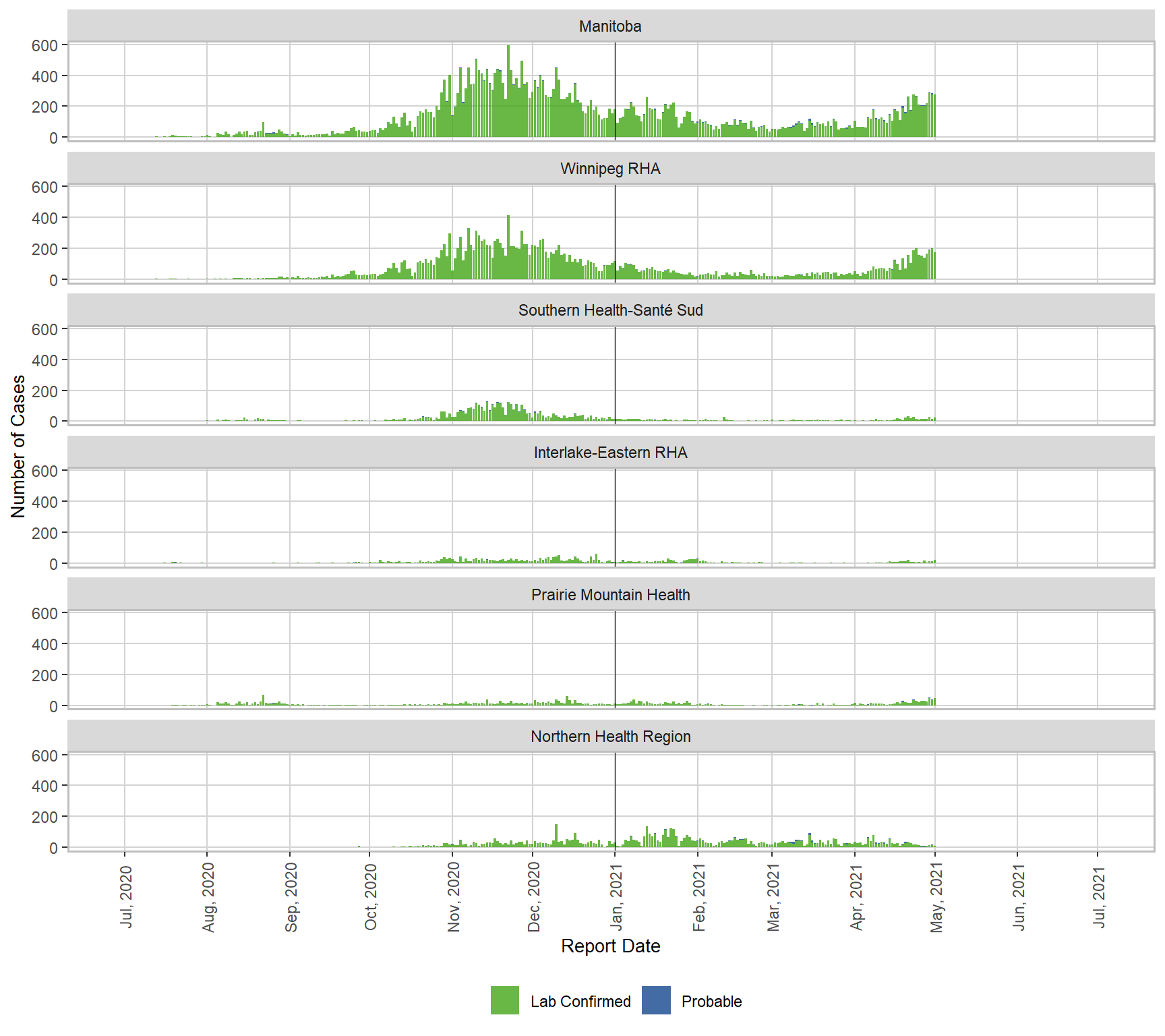 Figure 4. Cases of COVID-19 by Health Region and Public Health Report Date, Manitoba, June 2020 – Present