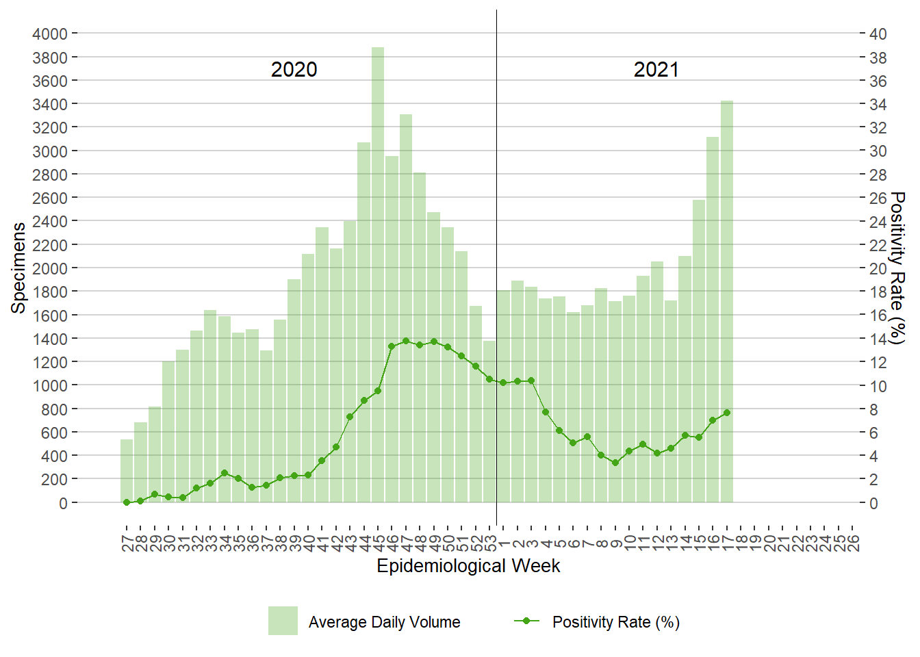 Figure 5. Average Daily Testing Volume and Positivity (%) for COVID-19 by Week of Specimen Receiving Date, Manitoba, June 2020 – Present