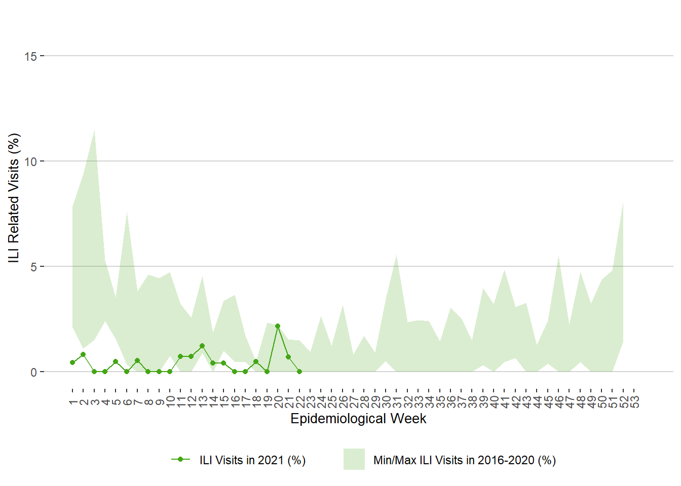 Figure 12. Weekly Percentage of ILI Related Visits to Sentinel Physicians, Manitoba, 2021