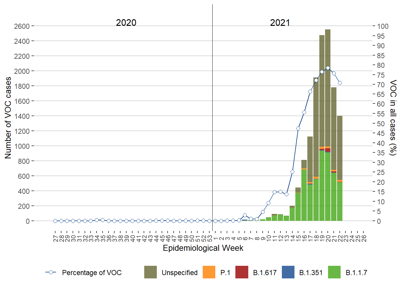 Figure 2. COVID-19 Cases of Variants of Concern (VOC) by Type and Percentage of VOC Cases in All Cases by Week of Public Health Report Date, Manitoba, June 2020 – Present