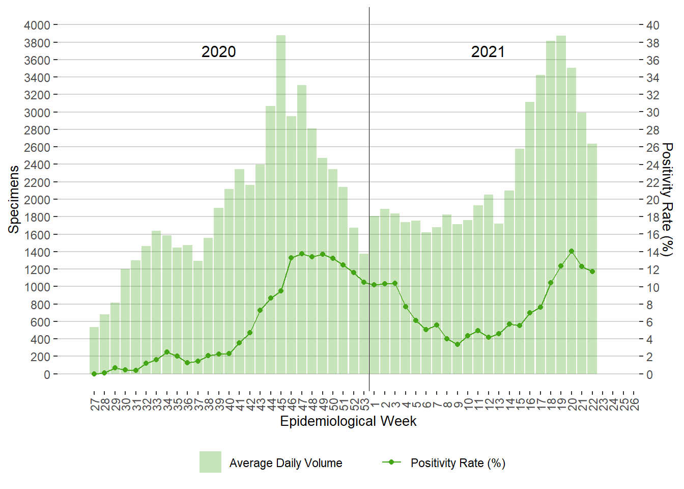 Figure 5. Average Daily Testing Volume and Positivity (%) for COVID-19 by Week of Specimen Receiving Date, Manitoba, June 2020 – Present