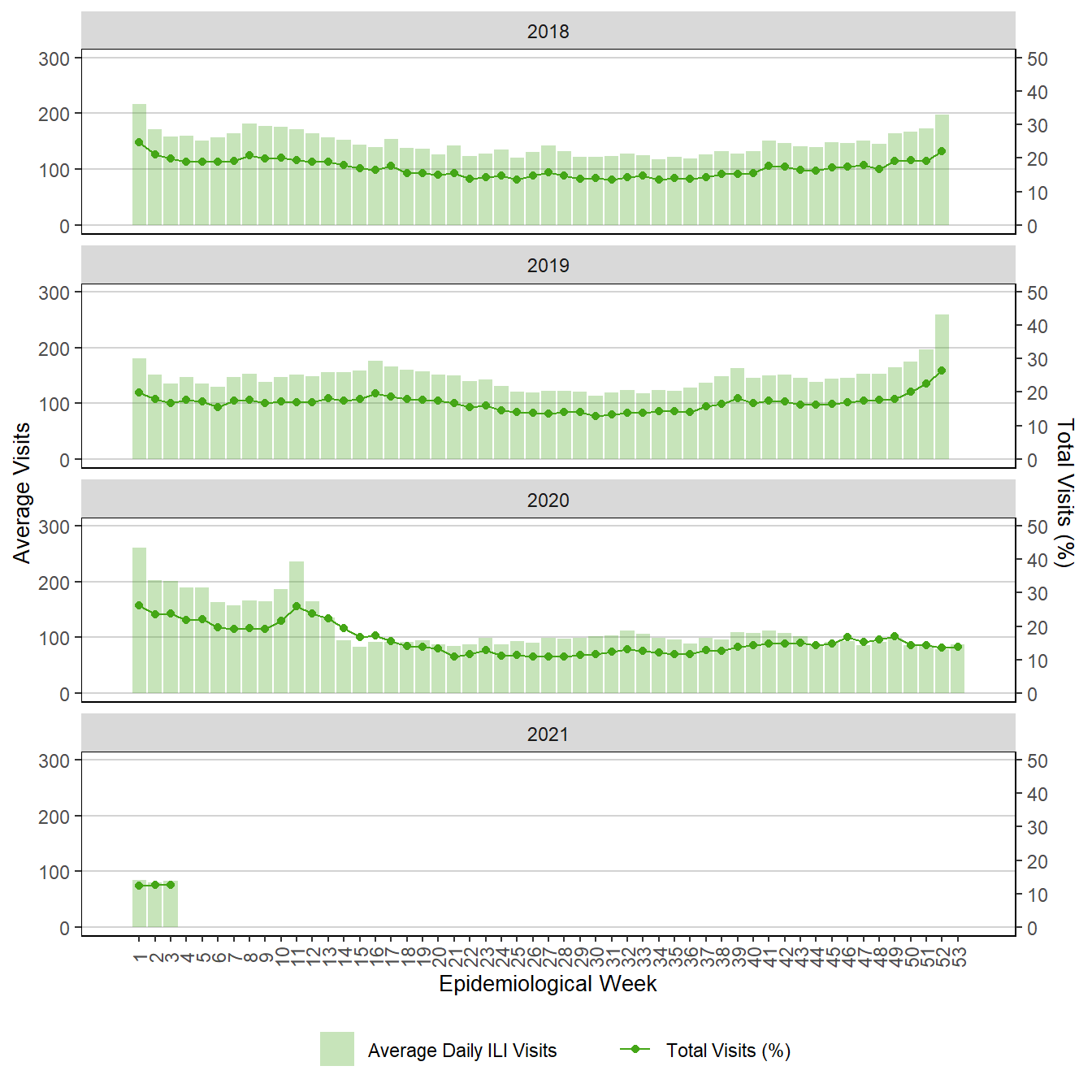 Figure 12. Weekly Respiratory Visits to Emergency Department, Winnipeg Regional Health Authority, Manitoba, 2018 – 2021