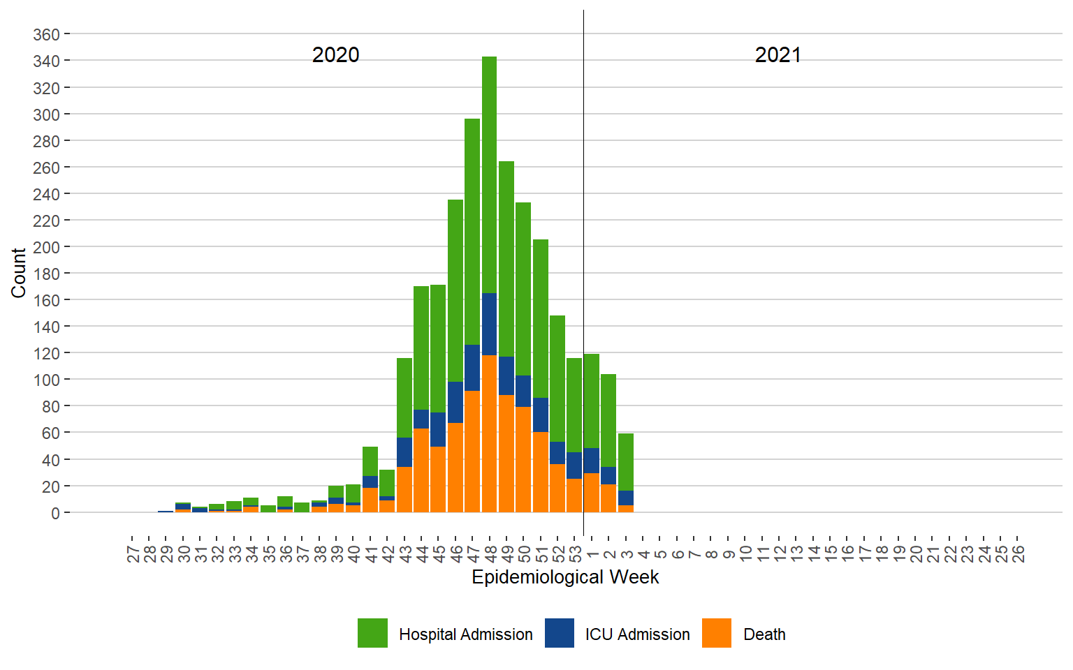 Figure 5. Severe Outcomes of COVID-19 by Week of Public Health Report Date, Manitoba, 2020 – 2021