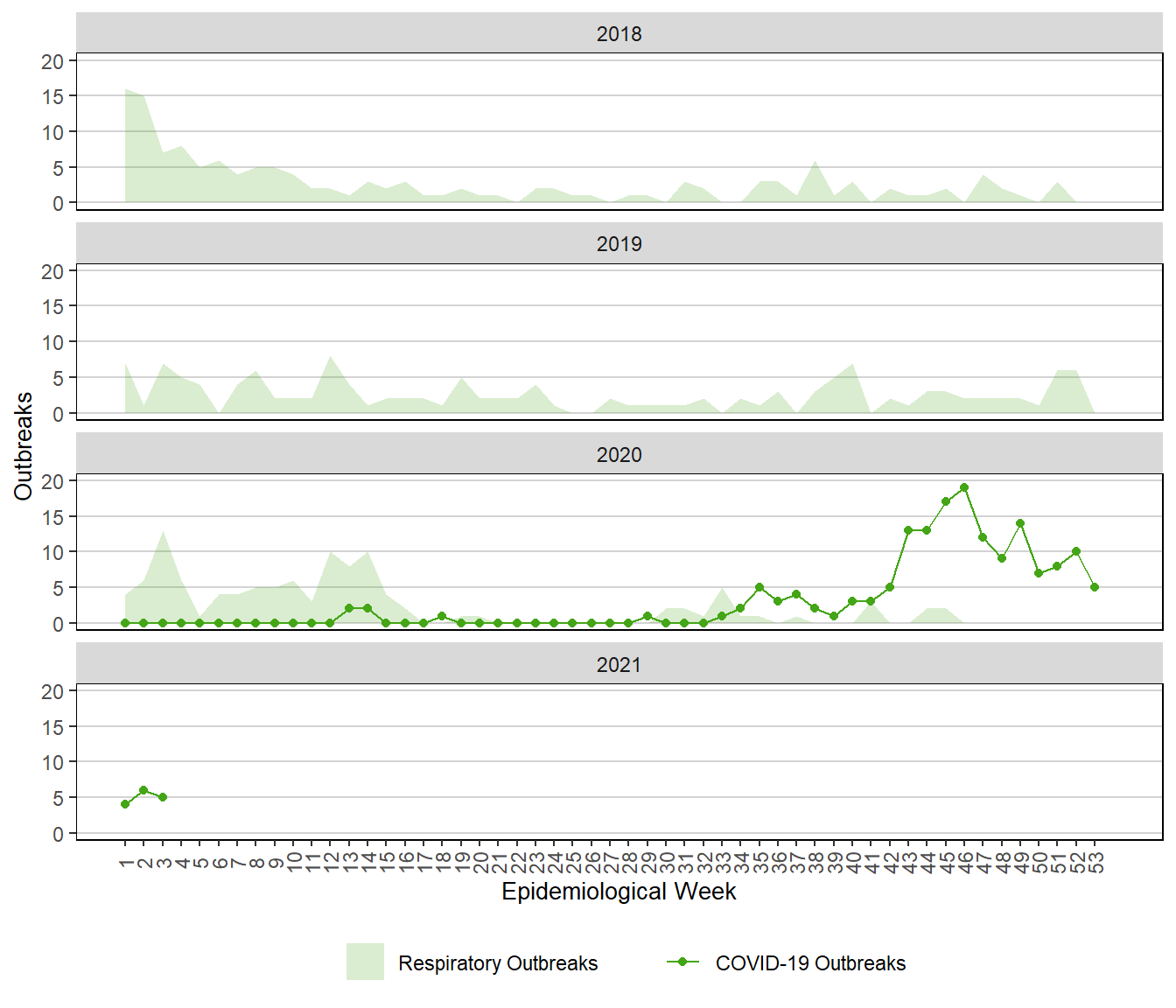 Figure 8. Weekly Respiratory and COVID-19 Outbreaks, Manitoba, 2018 – 2021