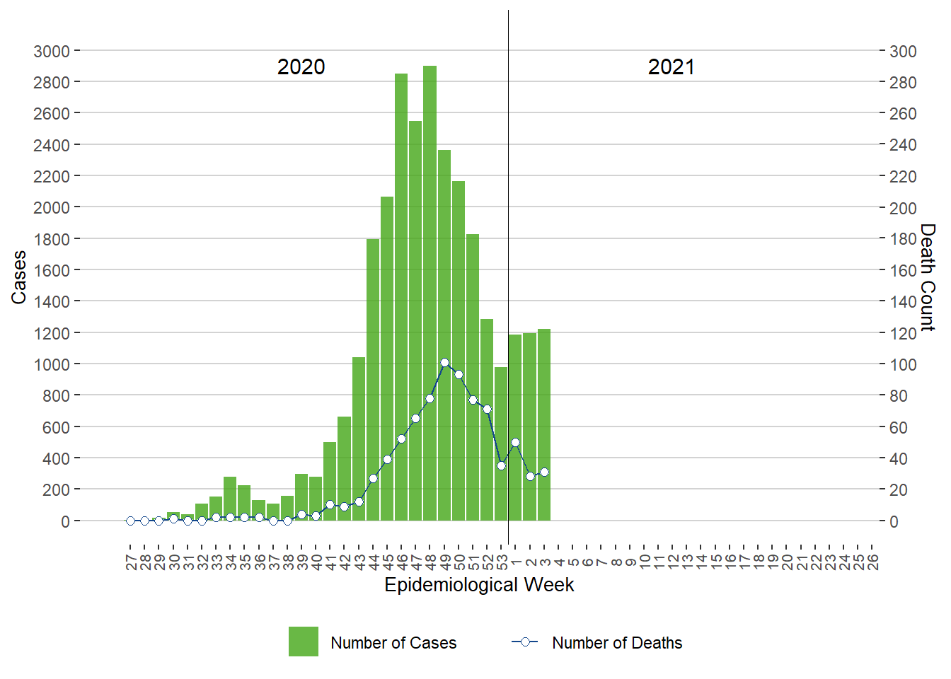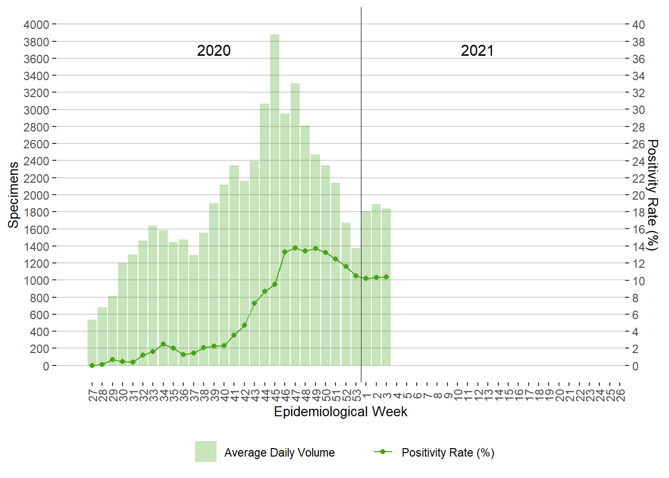 In Week 3, there were 1,219 laboratory-confirmed COVID-19 cases reported in Manitoba, a slight increase from 1,194 in the previous week. The volume of lab tests decreased to on average 1,837 people tested for COVID-19 per day compared to 1,888 in the previous week, and the positivity rate of lab tests was 10.3%, similar to the previous week.