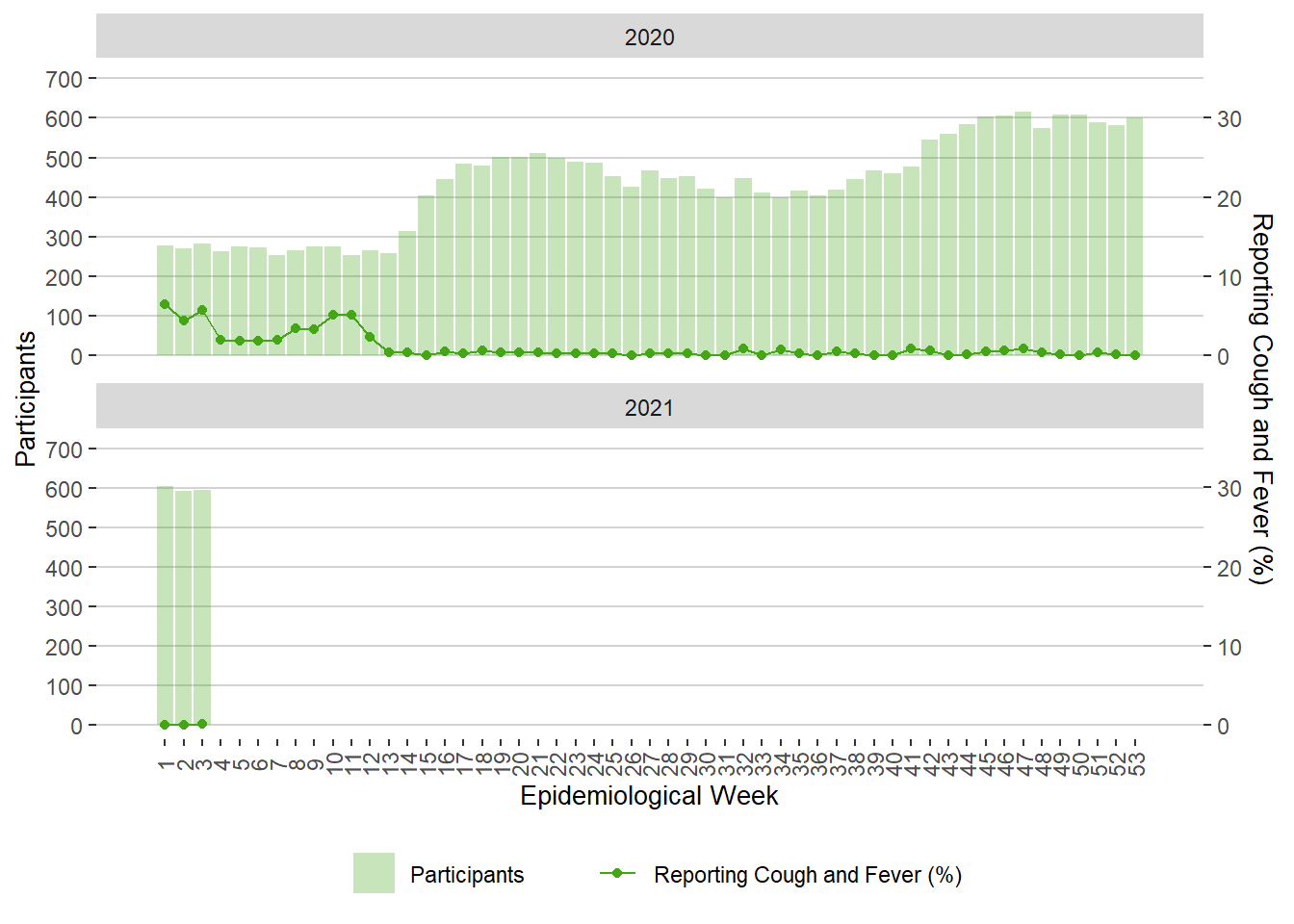Figure 10. Weekly FluWatchers Participants and Percentage Reporting Fever and Cough, Manitoba, 2021