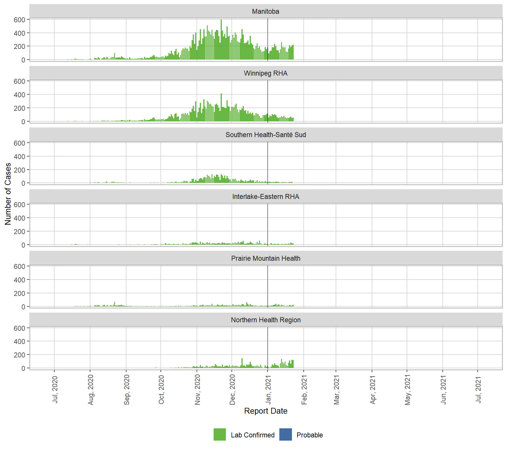 Figure 3. Cases of COVID-19 by Health Region and Public Health Report Date, Manitoba, 2020 – 2021